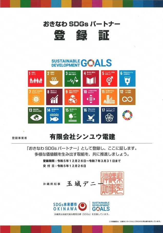 有限会社シンユウ電建は、この理念に賛同し、電気設備工事や通信・防災インフラの整備を通じて、持続可能な地域社会の発展に貢献しています。