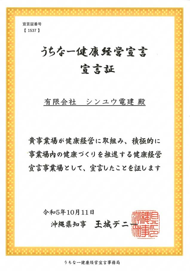 有限会社シンユウ電建もこの取り組みに賛同し、202X年に「うちなー健康経営」を正式に表明しました。